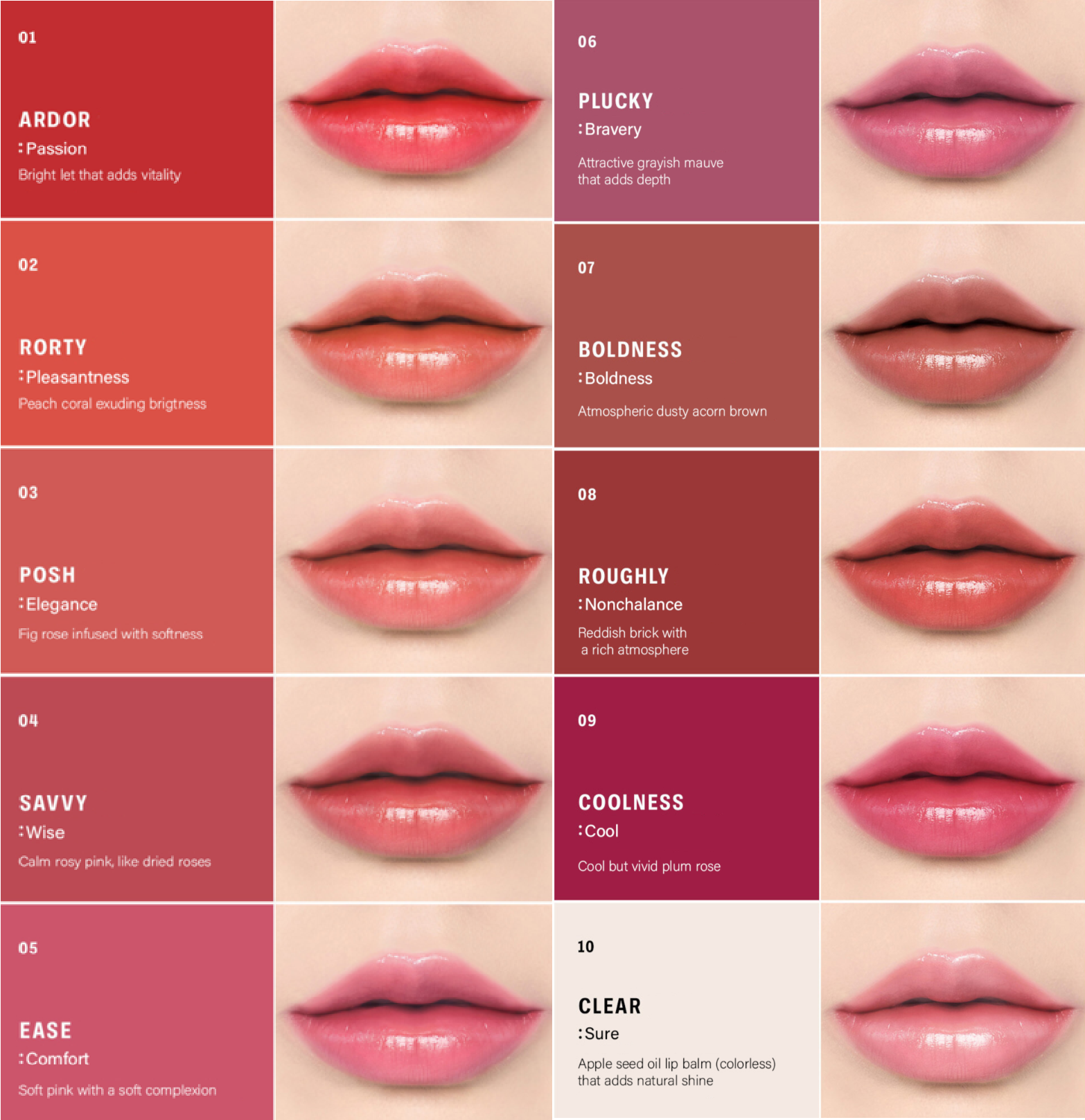 10 wearable tints + clear (glossy/Glow finish centered on natural radiance) |