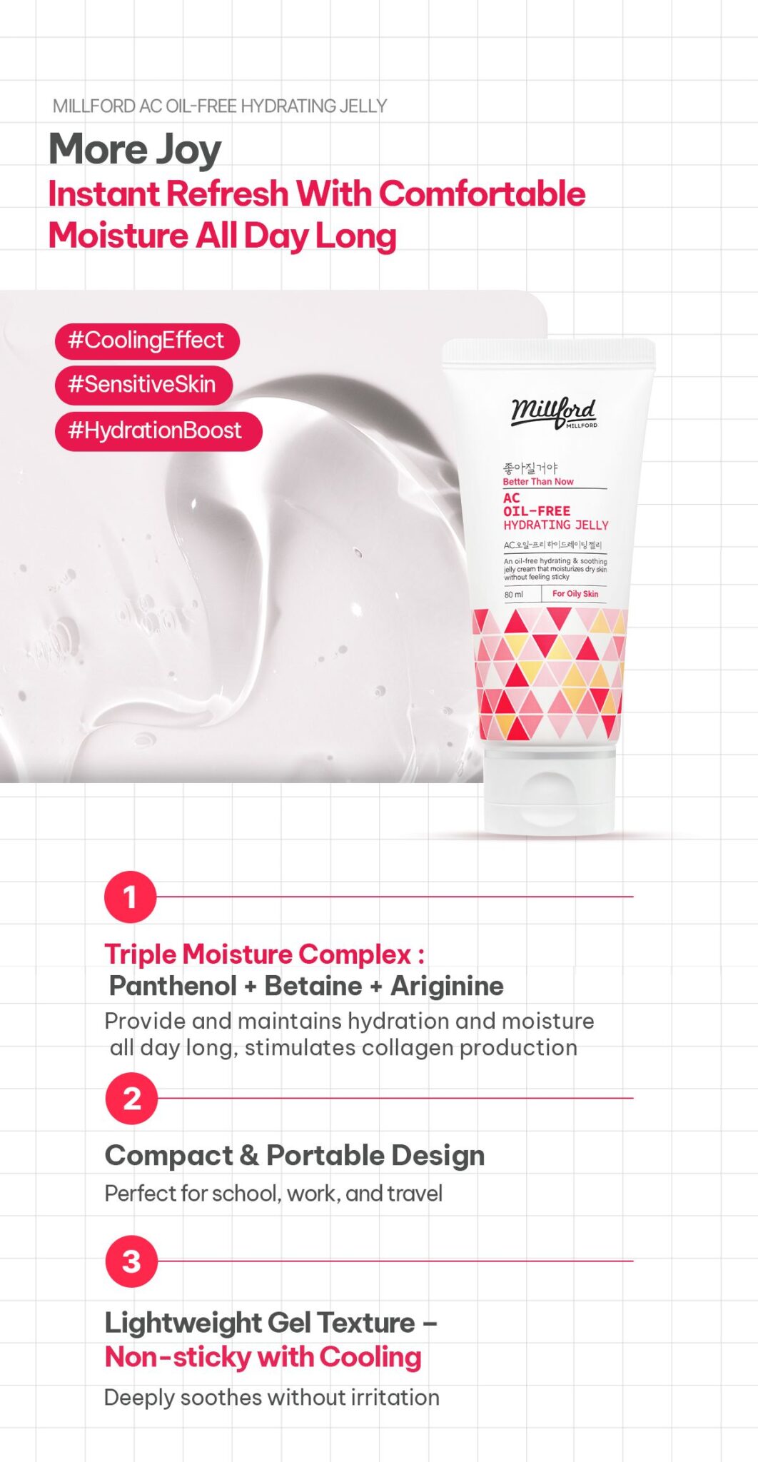 Millford AC Oil-Free Hydrating Jelly is a lightweight, gel-type moisturizer specifically formulated for oily and acne-prone skin. Delivering intense hydration without any greasy residue, it contains a blend of Panthenol, Betaine, Arginine, and Niacinamide to soothe, revitalize, and balance your skin. The oil-free, non-comedogenic formula quickly absorbs and leaves skin feeling fresh, soft, and shine-free—making it ideal for humid climates or anyone prone to congestion.
