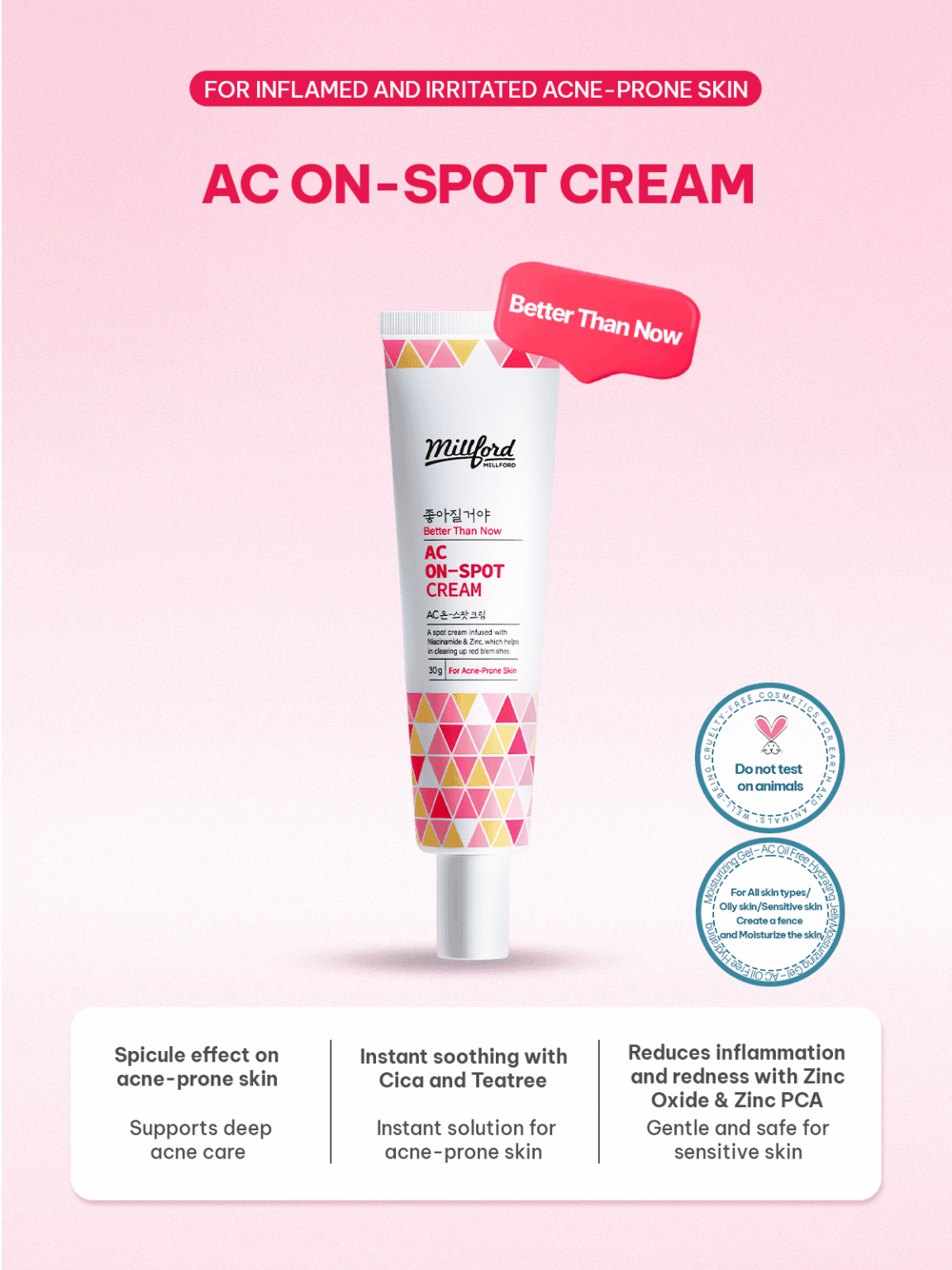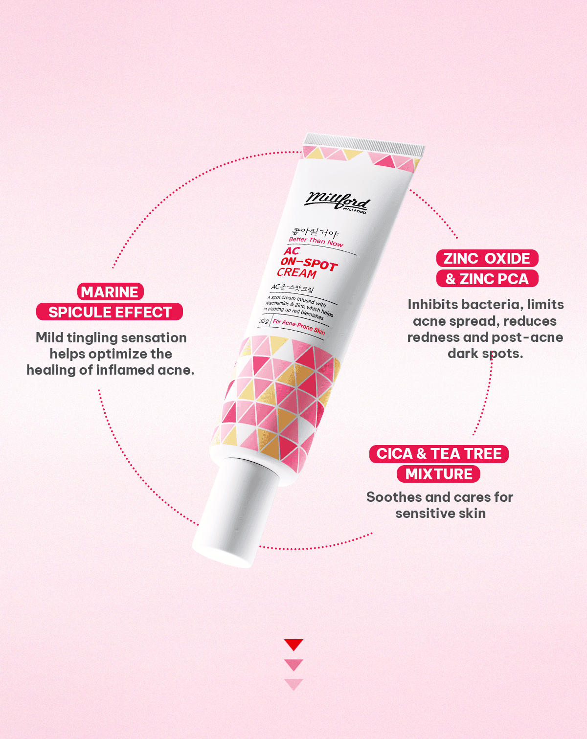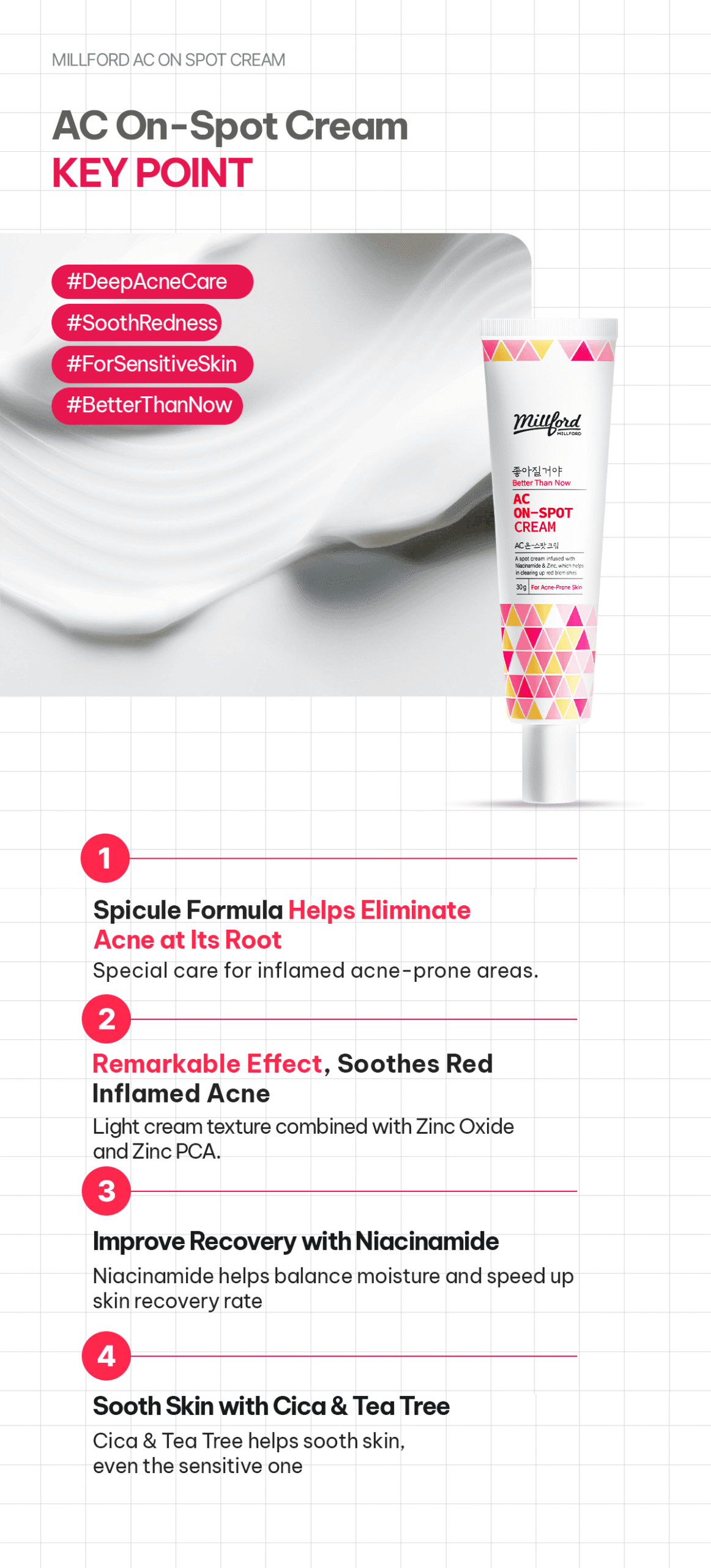 Millford AC On-Spot Cream is an intensive spot treatment designed to rapidly dry out blemishes, reduce redness and inflammation, and help fade post-acne hyperpigmentation. Engineered with a unique blend of spicules, niacinamide, zinc oxide, tea tree oil, and centella asiatica derivatives, this vegan and cruelty-free cream targets both active breakouts and leftover dark spots for clearer, more even-toned skin.