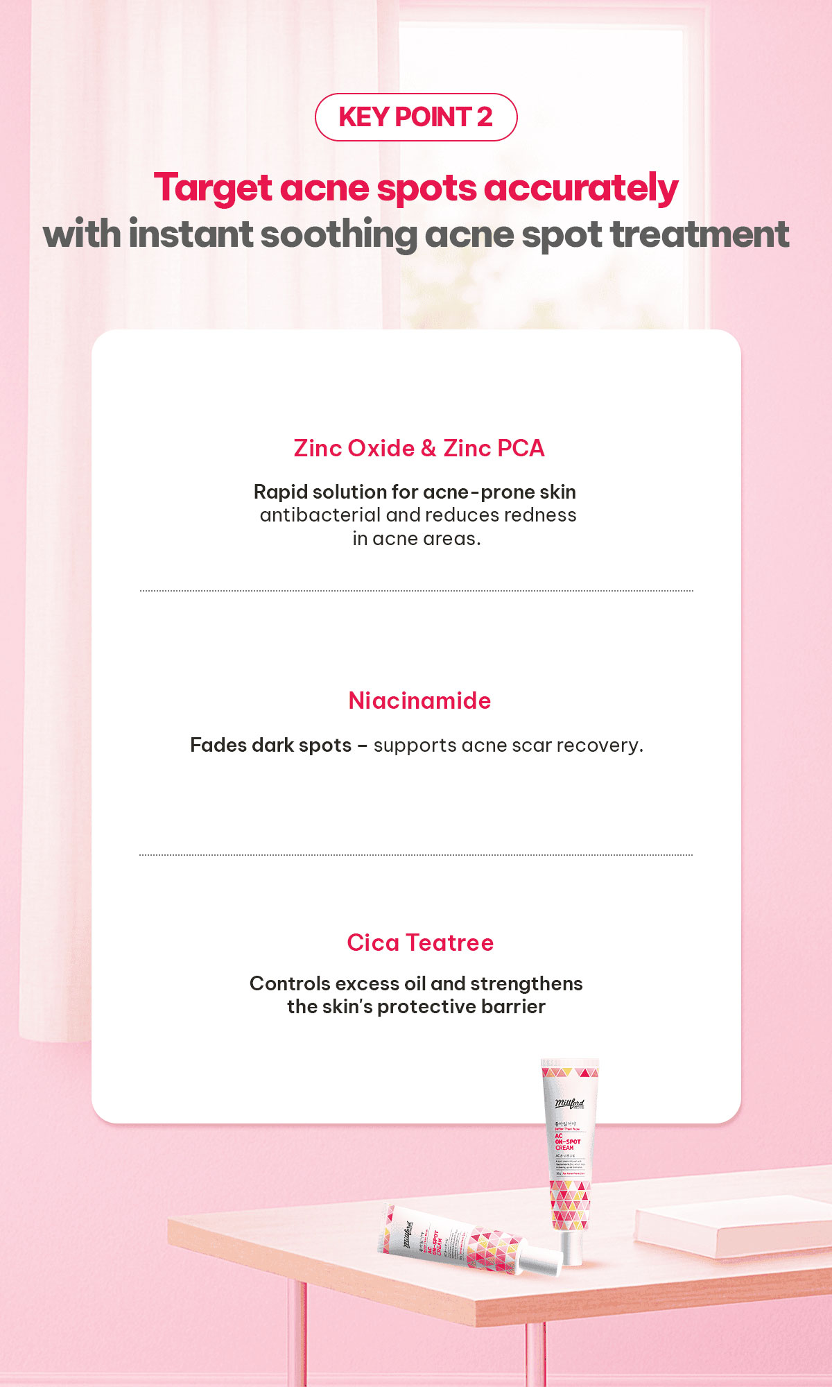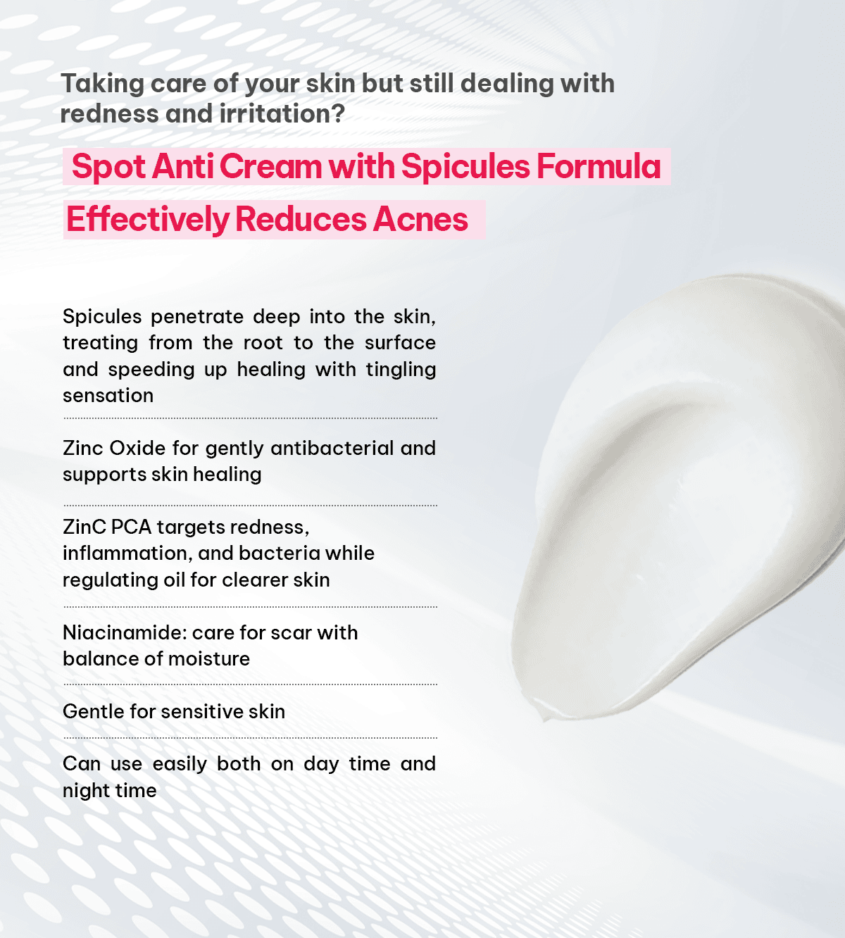 Spicules, Niacinamide, Zinc Oxide, Centella, Tea Tree |
