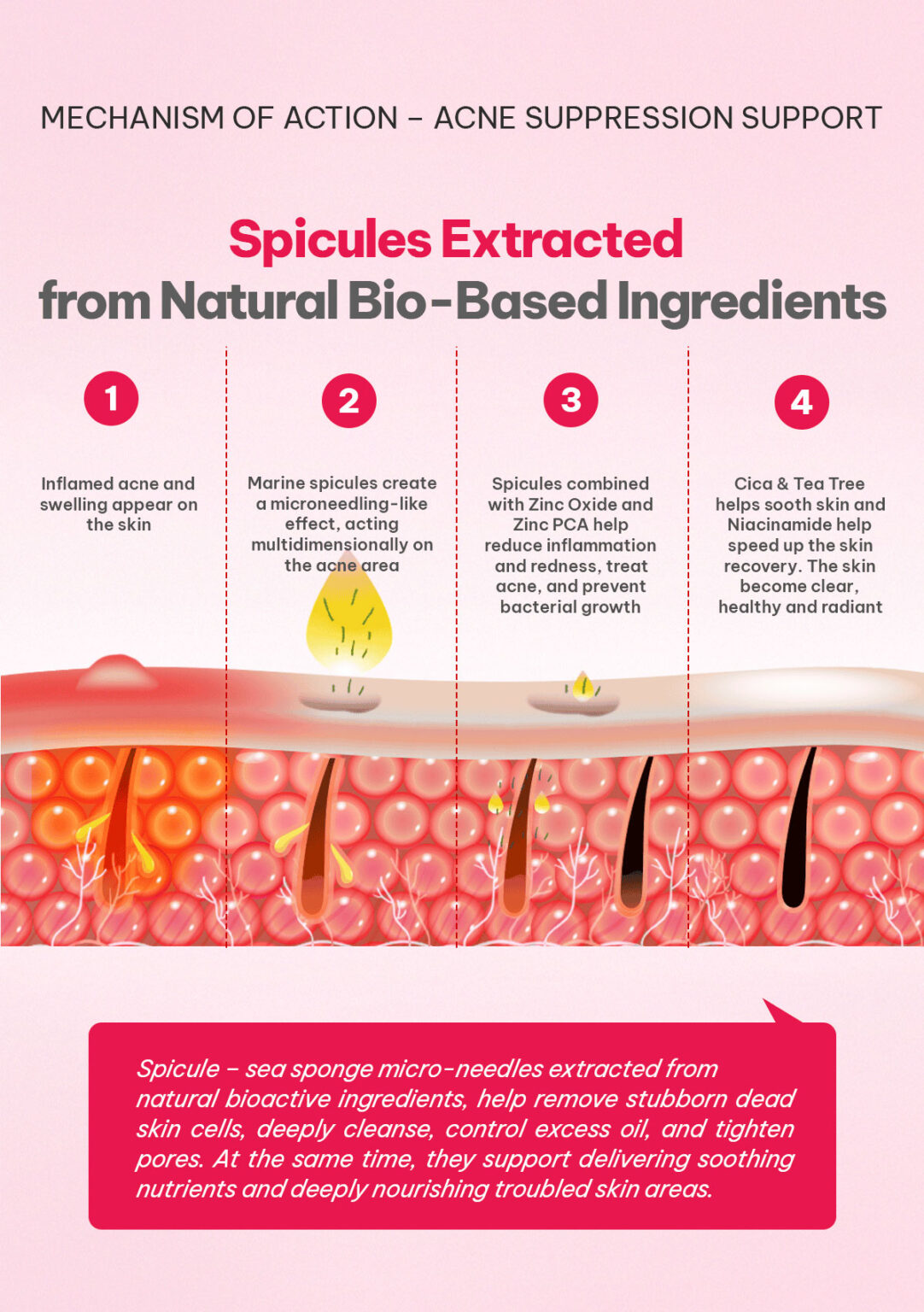 Spicules act as microscopic delivery boosters, allowing active ingredients to penetrate deeply for fast, effective spot treatment—expect a gentle tingling sensation as a sign of action. - Barrier Support & Healing