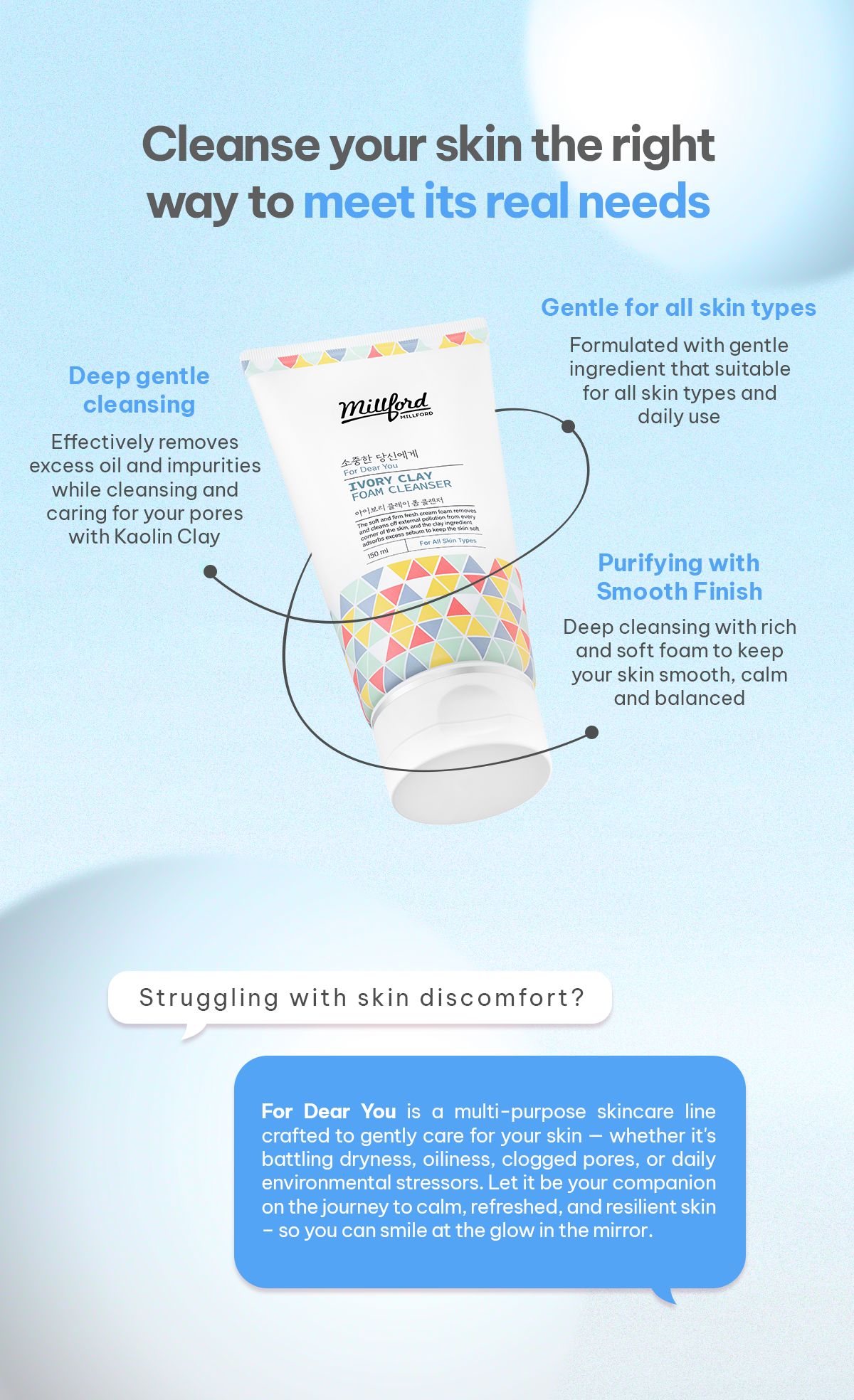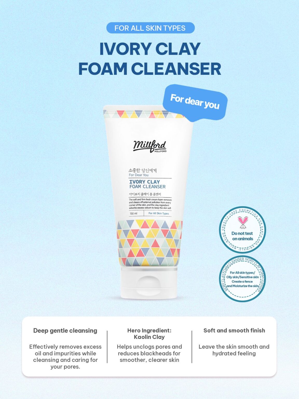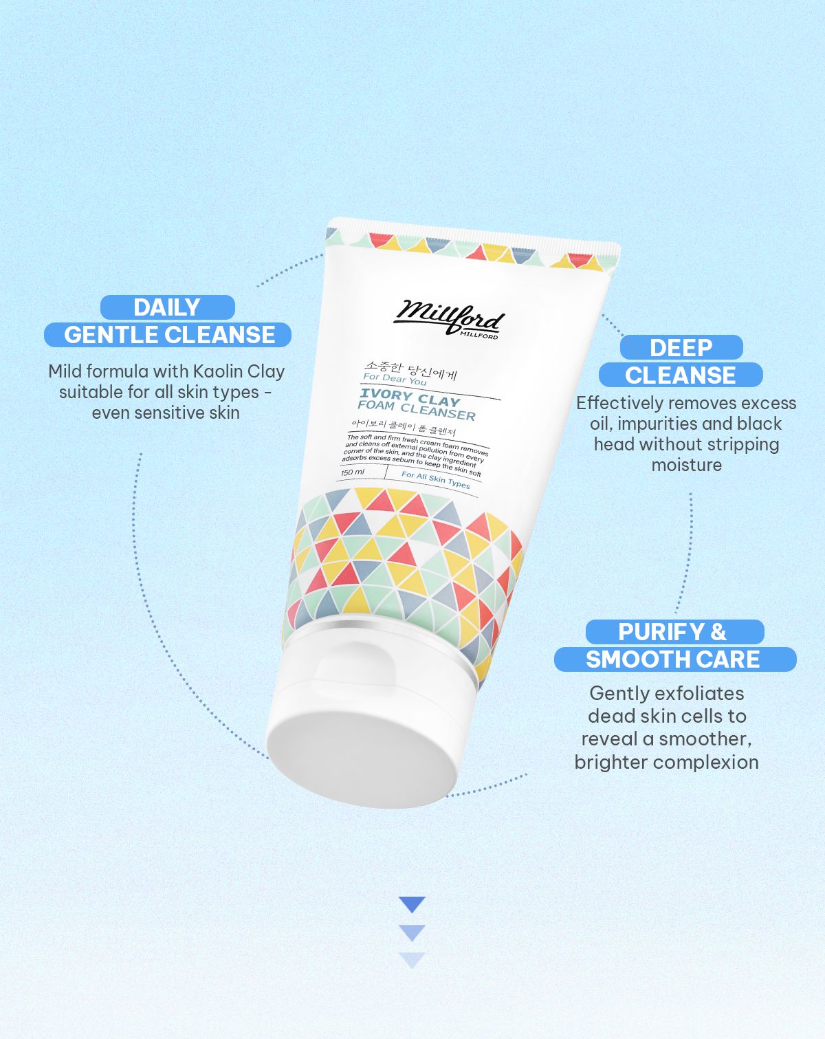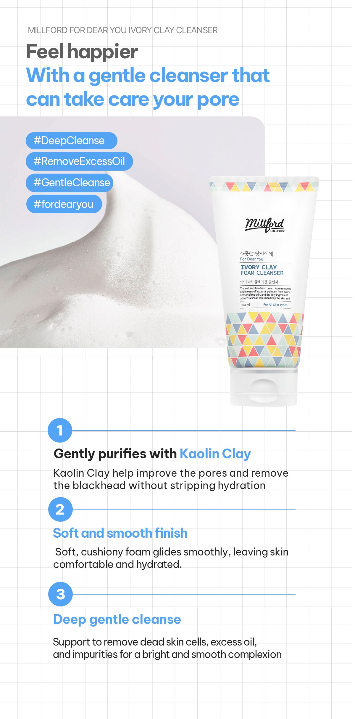 Millford Ivory Clay Foam Cleanser is a mild and non-irritating facial cleanser formulated with Kaolin (Ivory Clay), designed to deeply cleanse while keeping skin balanced and smooth. The unique blend of gentle surfactants and natural clay removes excess sebum, impurities, and dead skin cells from deep within the pores without causing irritation or dryness, making it suitable for all skin types—including sensitive and acne-prone skin.