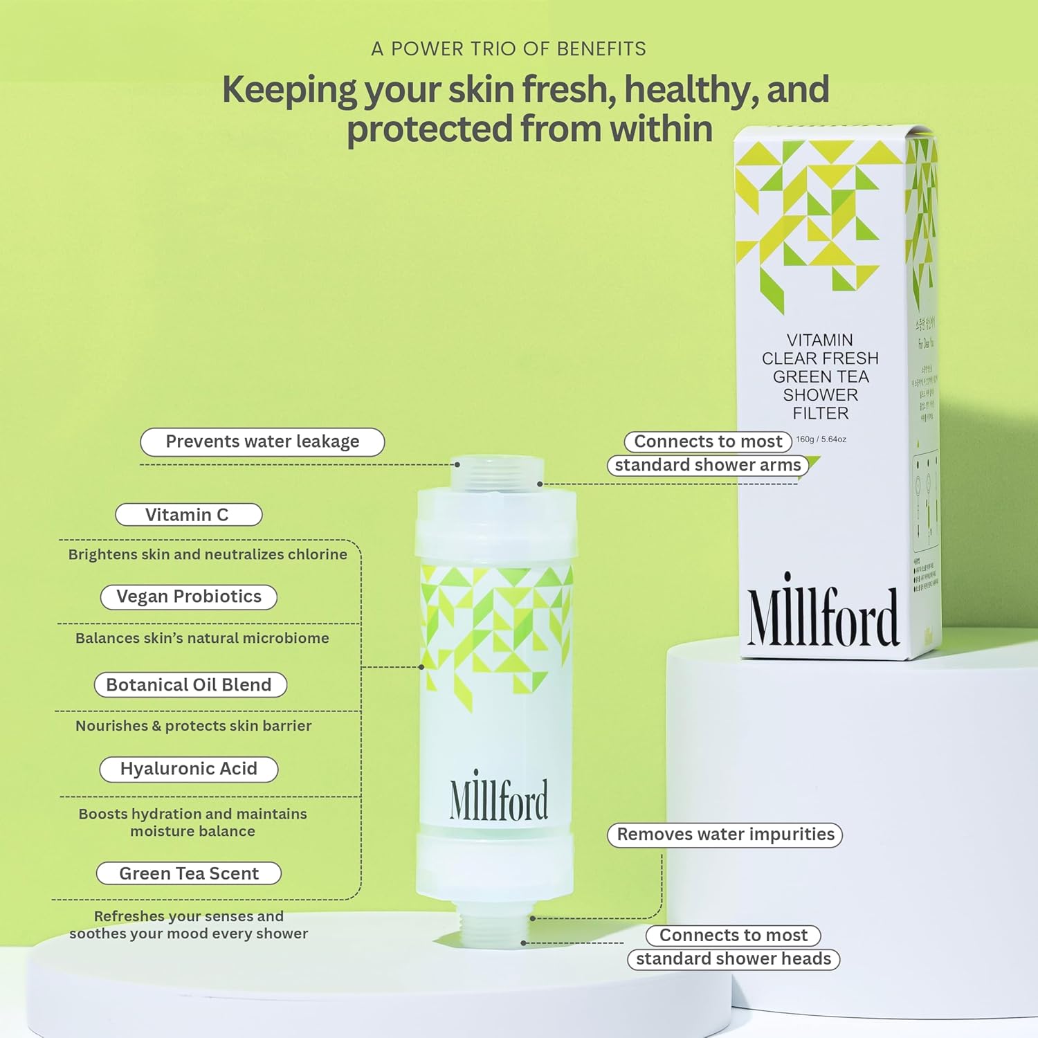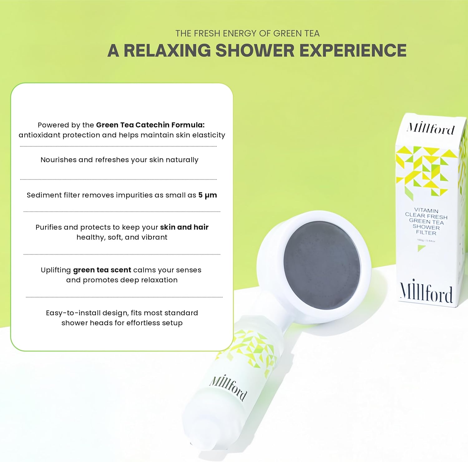 Transform your daily routine into a spa-like, skin-loving experience with the Millford Vitamin Clear Fresh Green Tea Filter—clean water, healthy skin, and a pure green tea aroma with every use.