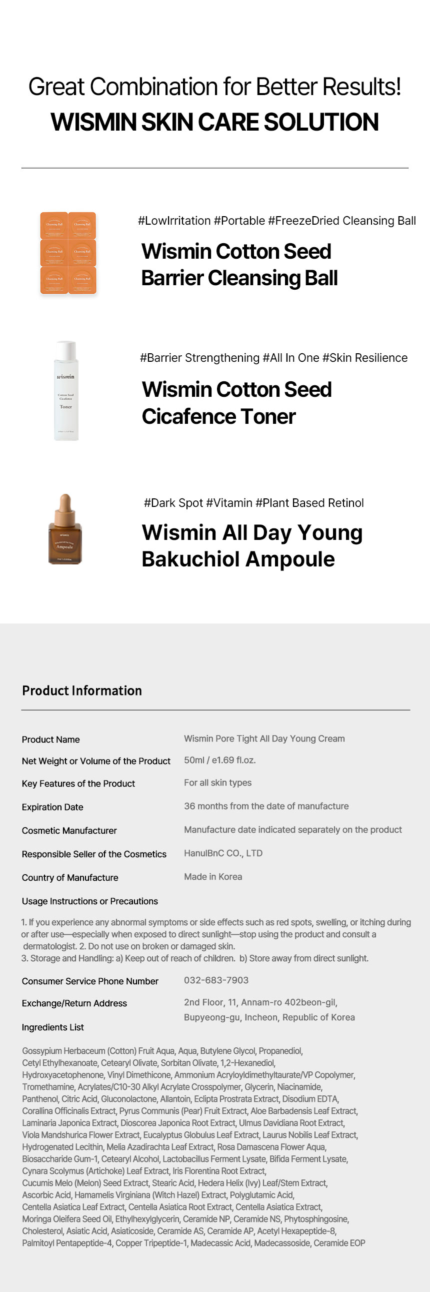 WISMIN Pore Tight All Day Young Cream is a soothing, vegan moisturizing cream designed specifically to tighten pores, control excess sebum, and strengthen the skin barrier. Infused with cotton fruit water (54.8%) and a specialized 3-step skin barrier complex, this cream provides hydration and calming benefits to keep skin clear, smooth, and balanced all day long.